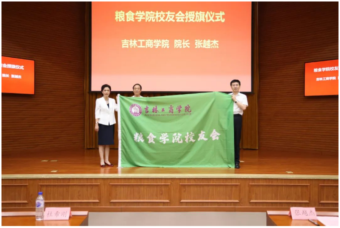 張?jiān)浇転榧Z食學(xué)院校友會授旗,吉林省和農(nóng)牧業(yè)集團(tuán)董事長方彥明先生。
